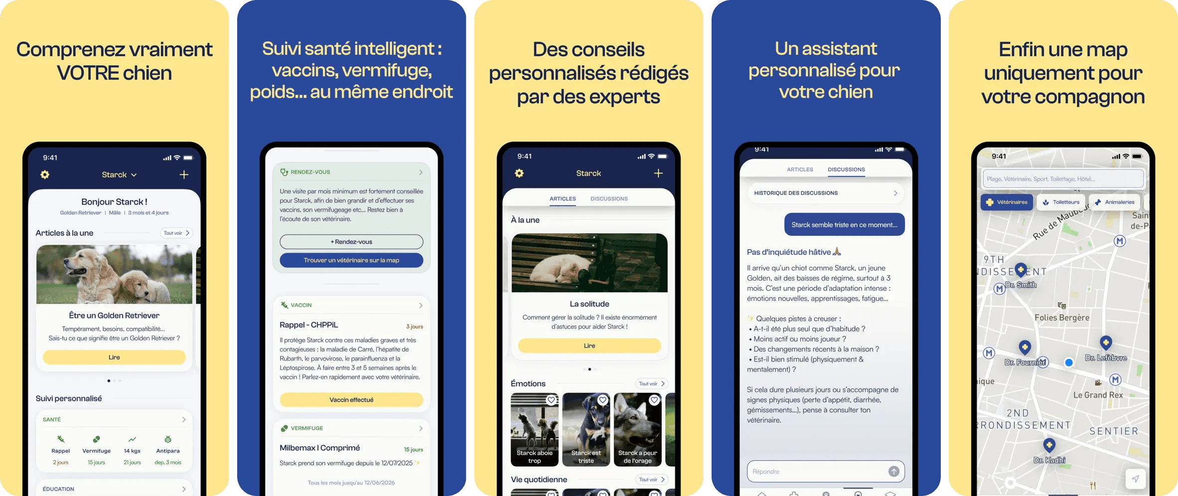 Un suivi de santé, des activités et jeux, une IA spécialisée, tout pour veiller sur le bon développement de son chien.